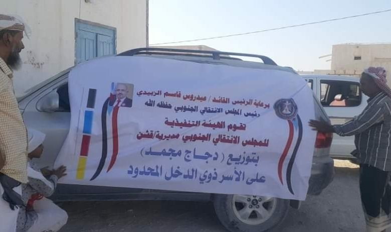 برعاية الرئيس القائد عيدروس قاسم الزبيدي رئيس المجلس الانتقالي الجنوبي نائب رئيس قيادة مجلس الرئاسة، دشنت القيادة المحلية للمجلس الانتقالي الجنوبي في مديرية قشن بمحافظة المهرة الخميس،توزيع الدجاج المجمد للأسر ذوي الدخل المحدود انطلاقاً من حي الشعب بالمديرية ويأتي ذلك ضمن الأنشطة الأنسانية للمجلس خلال الشهر الفضيل ، وفي التدشين القى رئيس القيادة المحلية للمجلس الأنتقالي الجنوبي بالمديرية الأستاذ صالح سعدان كلمة اكد فيها بأن المبادرة الأنسانية هذه تأتي دعماً للأسر محدودي الدخل خلال االشهر المبارك،وفي كلمته اوضح على توسع توزيع الدجاج المجمد إنطلاقاً من هذا الحي ليشمل بقية الاحياء مستهدفاً كافة الأسر محدودي الدخل.