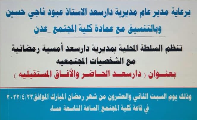 نظمت السُلطة المحلية في مديرية دار سعد وكلية المجتمع , السبت , أُمسيةً رمضانيةً مشتركةً للشخصيات المهتمة بالشأن العام في المديرية , لبلورة خارطة طريق , وصياغة إجماع شعبي للمساهمة في إعادة خدمات المدينة المهملة منذ سنوات .