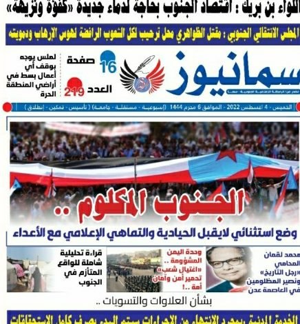تصفح العدد الورقي من صحيفة “سما نيوز” عدد رقم 219 الصادرة عن الرابطة الإعلامية الجنوبية -سما