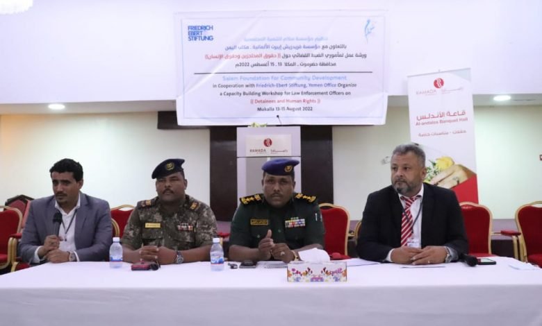 نظمت مؤسسة سلام للتنمية المجتمعية بالتعاون مع مؤسسة فريدريش أيبرت الألمانية مكتب/اليمن ورشة عمل لمأموري الضبط القضائي حول ” حقوق المحتجزين وحقوق الإنسان ” بمشاركة عدد من مسؤولي الضبط القضائي ورجال الأمن – خلال الفترة 13-15 أغسطس 2022م .