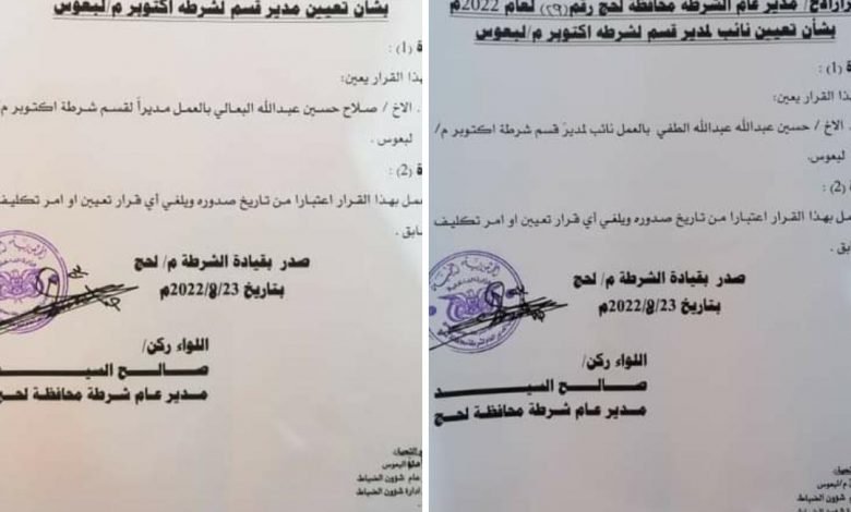 أصدر اللواء ركن / صالح احمد السيد قراراََ ادارياََ رقم 29-30 لعام 2022م أمس الثلاثاء بشأن تكليف مدير أمن قسم شرطة اكتوبر يافع لبعوس.