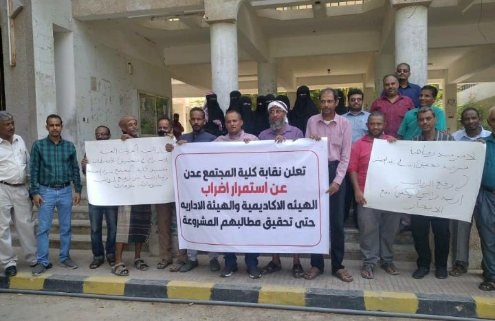 منتسبو كلية المجتمع بجامعة عدن ينفذون وقفة احتجاجية ويعلنون الاستمرار في الإضراب
