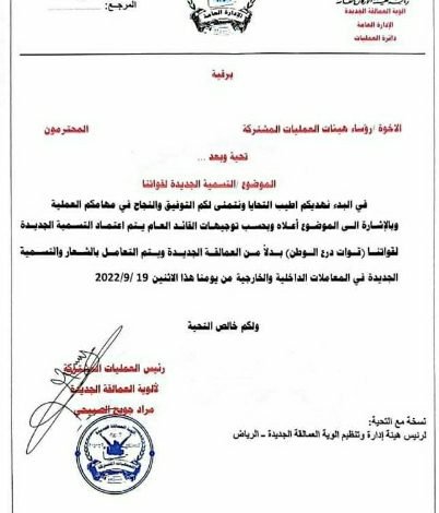 ودعت في التعميم جميع رؤوساء العمليات للتعامل بالاسم الجديد (قوات درع الوطن) بدلاً عن اسم العمالقة الجديدة في جميع المعاملات الداخلية والخارجية بدأ من اليوم الإثنين الموافق 19سبتمبر 2022م