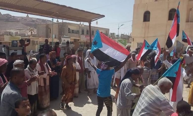 الوقفة الاحتجاجية التي دعا لها شباب الغضب بالمديرية يتقدم صفوفها أعضاء الهيئة التنفيذية للقيادة المحلية للمجلس الانتقالي الجنوبي بالمديرية وعدد من الشخصيات الاجتماعية والسياسية والشيوخ والأعيان والشباب