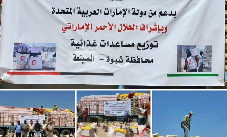 الهلال الأحمر الإماراتي يوزع 85 طن من المساعدات الغذائية على أهالي المصينعة بشبوة.