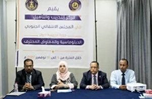 نظم مركز التدريب والتأهيل في المجلس الانتقالي الجنوبي، اليوم الأحد، في العاصمة عدن، دورة تدريبية بعنوان” الدبلوماسية والمفاوض المحترف” لعدد من كوادر مختلف هيئات المجلس الانتقالي، بحضور عضوي هيئة رئاسة المجلس، الدكتور ناصر الخبجي، رئيس وحدة شؤون المفاوضات، والدكتورة سهير علي احمد.