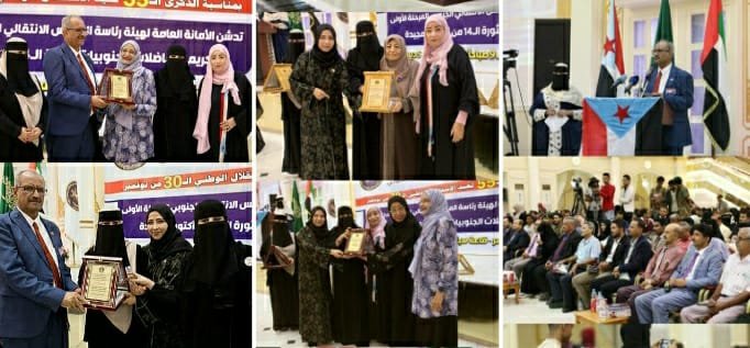 دشنت الأمانة العامة لهيئة رئاسة المجلس الانتقالي الجنوبي، اليوم الاثنين، في العاصمة عدن، المرحلة الأولى لتكريم المناضلات الجنوبيات لثورة الـ14 من أكتوبر المجيدة، بمناسبة الذكرى الـ55 لعيد الاستقلال الـ30 من نوفمبر، برعاية كريمة من الرئيس القائد عيدروس الزُبيدي، رئيس المجلس الانتقالي.