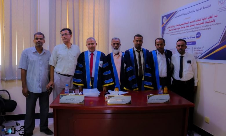 وقد تكونت اللجنة الخاصة بالمناقشة من الأستاذ الدكتور جميل أحمد باغفار كرئيسا ومناقشا داخليا بجامعة حضرموت والدكتور محمد صالح باشنيني كمشرفا علميا بجامعة حضرموت والدكتور ناصر مسعود ناصر كمناقشا خارجيا بجامعة أبين،حيث تمت المناقشة بقاعة الدراسات العليا بكلية العلوم.