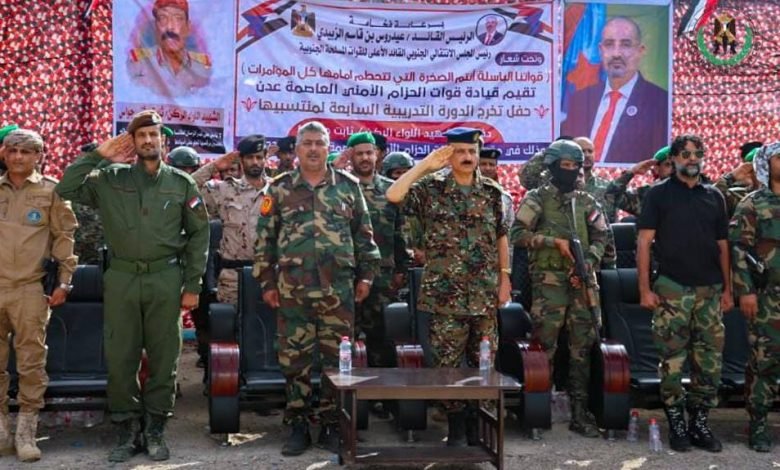 قوات الحزام الأمني بالعاصمة عدن تقيم عرضاً عسكرياً مهيباً بتخرج الدفعة السابعة من منتسبيها