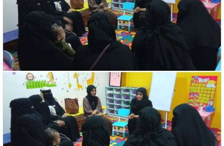 الأستاذة خديجة العولقي وحيث اشتملت الجلسة على عدة أنشطة بداية بالتعرف على الأمهات وتعريفهن بالجلسة، ومناقشة تعريف عن كيفية تربية الاطفال منذ طفولتهم حتى بلوغهم السن القانوني وذلك بتقديم لهم الإرشاد الاجتماعي من خلال تنفيذ أنشطة تربوية ترفيهية داعمة في نمو الطفل الوجداني والسلوكي بشكل سليم.