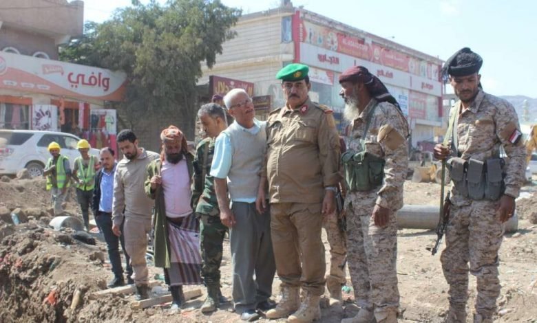 واطلع المحافظ بمعية وكيل المحافظة لشؤون المنظمات الدولية رئيس الهئية للاغاثة والاعمال الانسانية اكرم قاسم مقبل ،ومدير عام مكتب الاشغال العامة عبد الرحمن فريد سير العمل في مشروعي رصف طريق العرشي وشارع صالح قاسم ومشروع الصرف الصحي في المدينة.