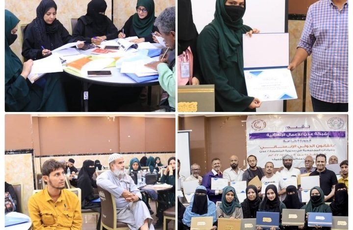 شبكة عدن للأعمال الإنسانية تختتم المرحلة الثانية لدورتها التدريبية في القانون الدولي الإنساني