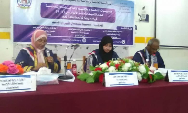 نالت صباح اليوم الثلاثاء الباحثة حميدة سليمان على درجة الماجستير بامتياز في الرسالة الموسومة: صعوبات التعليم وعلاقته بالحاجات الإرشادية لدى تلاميذ التعليم الأساسي (٦-٩) في مديرية تبن محافظة لحج .حيث ناقشت الباحثة الرسالة المقدمة إلى قسم علم النفس في قاعة الفقيد أ . د عبدالكريم