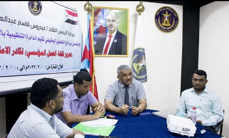 دشنت الدائرة التنظيمية في الأمانة العامة لهيئة رئاسة المجلس الانتقالي الجنوبي، اليوم الاحد، في مقر الأمانة العامة في العاصمة عدن، المرحلة الثانية لبرنامج التطوير الوظيفي لكادر الأمانة العامة، بدورة تدريبية بعنوان: “تعزيز ثقافة العمل المؤسسي”.
