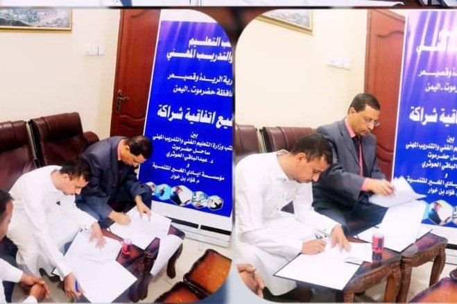 وقع الدكتور عبدالباقي الحوثري مدير عام مكتب وزارة التعليم الفني والتدريب المهني بساحل حضرموت بمكتبه اليوم مع المدير التنفيذي لمؤسسة ايادي الخير للتنمية الأستاذ فؤاد سعيد خوار اتفاقية شراكة تنص في ديباجيتها على إنشاء وفتح شعب دراسية جديدة للمعهد التقني التجاري / فوه والمعهد المهني الصناعي /بخلف المكلا بمديرية الريدة وقصيعر في مجال التخصصات (المحاسبة ، التبريد والتكييف) مهني وشعب ملحقه بالصناعي بخلف مجال (التبريد والتكييف) .