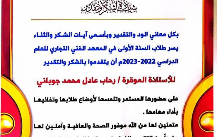 وقدم الطلاب للاستاذة رحاب (شهادة شكر وتقدير) نظير جهودها وحضورها المستمر وتفانيها بإداء مهامها وتلمسها لأوضاع طلابها، خلال مدة تدريسها في الفصل الأول من العام الدراسي الحالي.