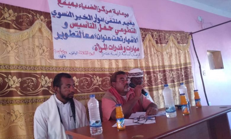 أقام ملتقى أنوار الخير النسوي التطوعي عصر يوم أمس الثلاثاء حفل التأسيس و الإشهار للملتقى برعاية مركز الضياء بميفع وإشراف مكتب الشؤون الاجتماعية والعمل بمديرية بروم ميفع بقاعة المركز الكبرى.