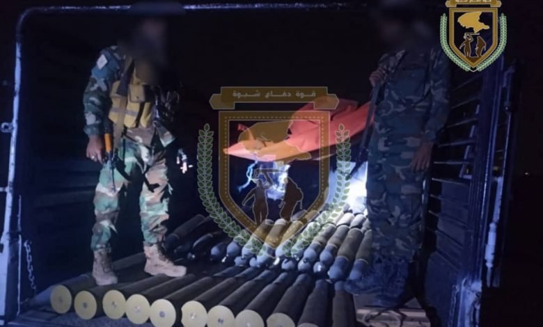 دفاع شبوة يضبط شحنة من الذخائر والقذائف المهربة قادمة مأرب اليمنية.