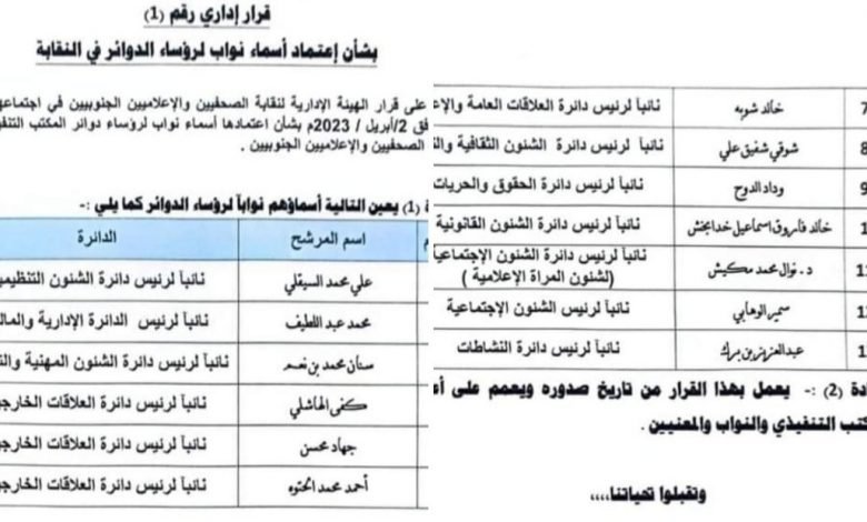 نقيب الصحفيين والاعلاميين الجنوبيين يصدر القرار رقم (١) لعام٢٠٢٣م بشان اعتماد نواب لرؤساء الدوائر في النقابة.