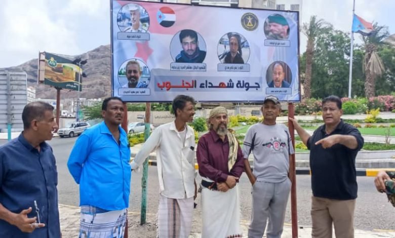 انتقالي المعلا يرفع عددا من صور شهداء الجنوب وسط جولة الشهداء بالمديرية.