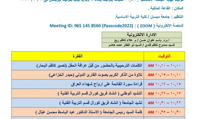 وقد بدأت جليت الافتتاح الساعة العاشرة صباحا بتوقيت بغداد السابعة بتوقيت غرينتش، وذلك في رحاب القاعة الملكية بكلية التربية الاساسية جامعة ميسان حضوريا، وإلكترونيات عبر الرابط الالكتروني على منصة zoom .