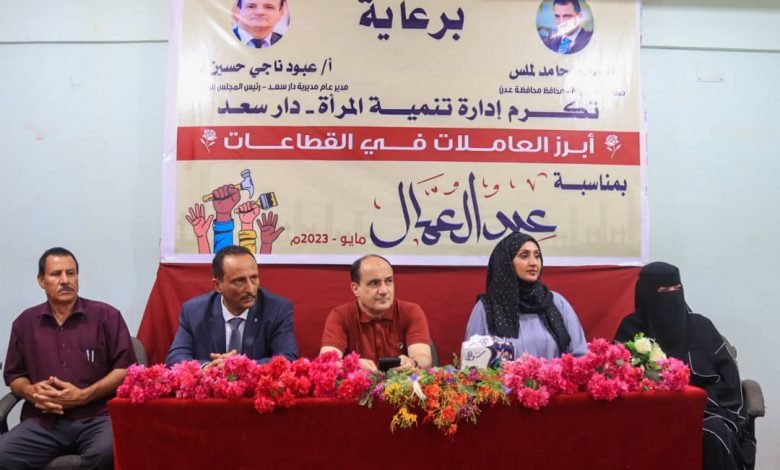 نظمت إدارة تنمية المرأة بمديرية دارسعد ممثله بمديرة الادارة الاستاذة هيفاء فرج ، صباح اليوم الخميس الموافق 11 مايو 2023م ، حفلا تكريما للموظفات العاملات بديوان السلطة المحلية ومختلف مرافق و هيئات ومؤسسات الدولة بالمديرية ، وذلك بمناسبة اليوم العالمي لعيد العمال ال 1 من مايو .