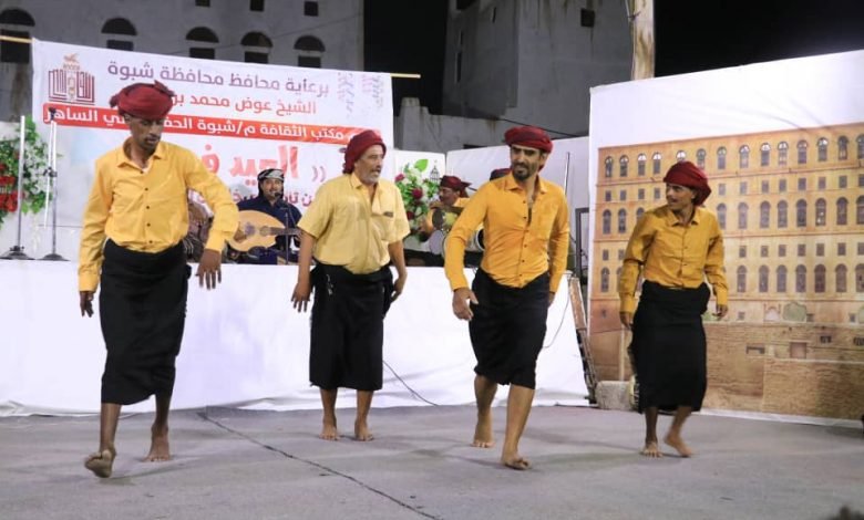 وتضمنت الأمسية باقة متميزة ورائعة من الوصلات الغنائية والرقصات الشعبي من ألثراث الشبواني المتنوع، والفقرات الفكاهية، أحيتها الفرقة الفنية لمكتب الثقافة بالمحافظة، وذلك ضمن خطة مكتب الثقافة لعكس فرحة العيد ورسم البهجة على أوجه المواطنين والمشاركة فيها، على طريق مهرجان شبوة الرابع للتراث والفنون.