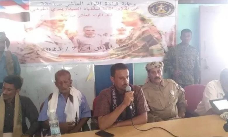 شهدت مديرية المسيمير محافظة لحج, يوم الثلاثاء حفل خطابي بمناسبة الذكرى الـثالثة لإستشهاد العميد يسري العمري الحوشبي قائد اللواء العاشر صاعقة الذي أستشهد في 4 يوليو 2020م في قرن الكلاسي بمنطقة الشيخ سالم في محافظة أبين.