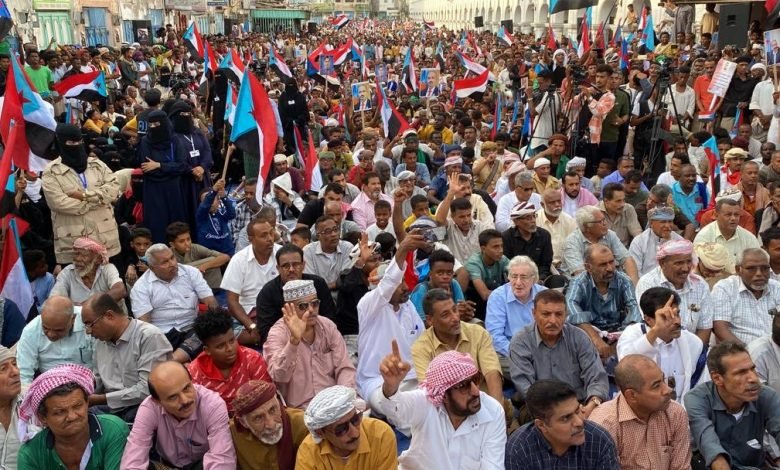 المتظاهرون في فعالية يوم الأرض بساحة الحرية بالمكلا يطالبون بدولة الجنوب.