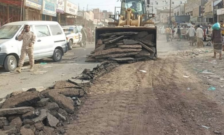 بدء أعمال صيانة وإعادة تأهيل الشارع الرئيسي والخلفي لمدينة الحبيلين في لحج.