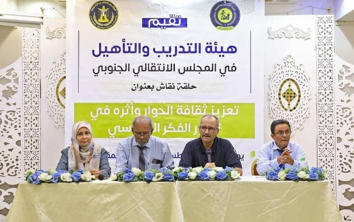 نظمت هيئة التدريب والتأهيل في المجلس الانتقالي الجنوبي، اليوم الأحد، حلقه نقاشية حول تعزيز ثقافة الحوار وأثره في تطوير الفكر السياسي، بحضور الأستاذ فضل محمد الجعدي عضو هيئة الرئاسة، نائب الأمين العام.