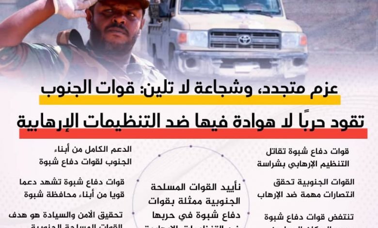إنجازات قوات دفاع شبوة في مكافحة الإرهاب وفي تثبيت الأمن والإستقرار والسكينة العامة والحفاظ على المصالح العامة و الخاصة، تسير بوتيرة عالية، ودون شك المواطن في محافظة شبوة، في الحضر والأرياف النائية، لمس هذه الإنجازات في حياته وأمنه وامانه، ولهذا فإن هذه الانجازات تثير قلق وخوف اطراف لا تريد ان ترى شبوة آمنة مستقرة .