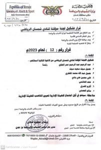 وقضى القرار الذي جاء بناءً على المادة ( 1) وبقرار رقم ( 12) لعام 2023، بشأن تكليف إدارات الأندية والاتحادات الرياضية، تشكيل لجنة مؤقتة لنادي شمسان الرياضي بمديرية المعلا، من الإخوة التالية اسمائهم :