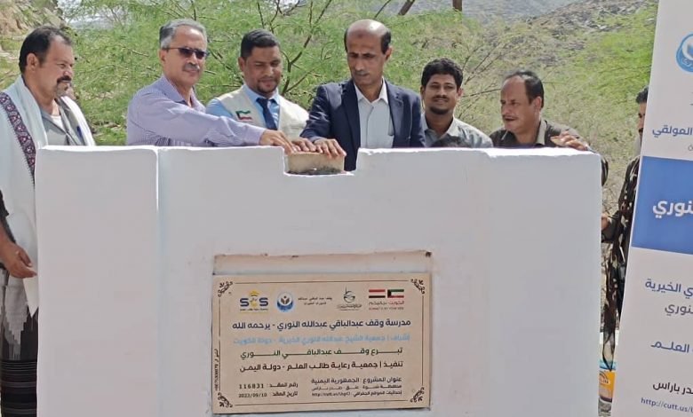 على صعيد متصل قام مدير عام مكتب التربية والتعليم بالمحافظة سالم حنش ومدير عام مديرية عتق عبدالله الخليفي ، وبحضور المدير التنفيذي لجمعية رعاية طالب العلم بالمكلا منير عادل ، بوضع حجر الاساس للمدرسة المكونة من عشرة فصول دراسية مع الملحقات ، ونوها حنش والخليفي بتزامن توقيع اتفاقية انشاء المدرسة ، مع وضع حجر الاساس لها ، واشادا باستعداد الجمعية لتنفيذها باسرع وقت ممكن .