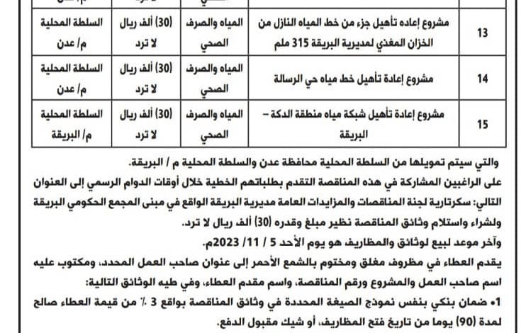 يعلن المجلس المحلي بمديرية البريقة في العاصمة عدن، عن رغبته في إنزال ( 4 ) مناقصات عامة لتنفيذ أعمال مشاريع في قطاع المياه والصرف الصحي، والتي سيتم تمويلها من السلطة المحلية بالمحافظة والمديرية، وهي كالآتي: