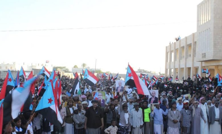 ورفع المحتشدون أعلام دولة الجنوب وصور الرئيس القائد عيدروس قاسم الزبيدي واعلام دولة الامارات العربية الشقيقة واعلام فلسطين المحتلة.