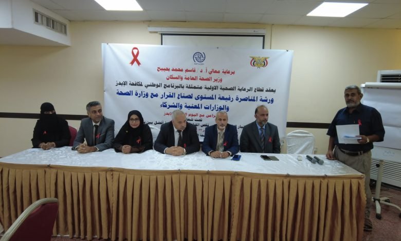 نظم البرنامج الوطني لمكافحة الإيدز بوزارة الصحة بالعاصمة عدن اليوم ورشة المناصرة رفيعة المستوى لصناع القرار مع وزارة الصحة والوزارات المعنية والشركاء