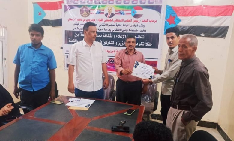 إدارة الإعلام والثقافة بمنسقية الانتقالي بجامعة أبين تنظم حفلاً تكريمياً للفائزين والمشاركين في مسابقة الشعر والقصة.
