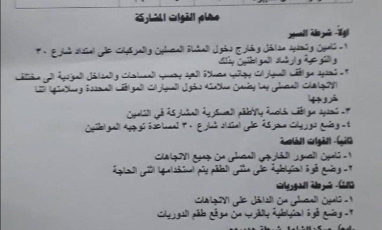 ١- تأمين وتحديد مداخل ومخارج المشاة المصلين والمركبات على امتداد شارع ٣٠ والتوعية وإرشاد المواطنين بذلك