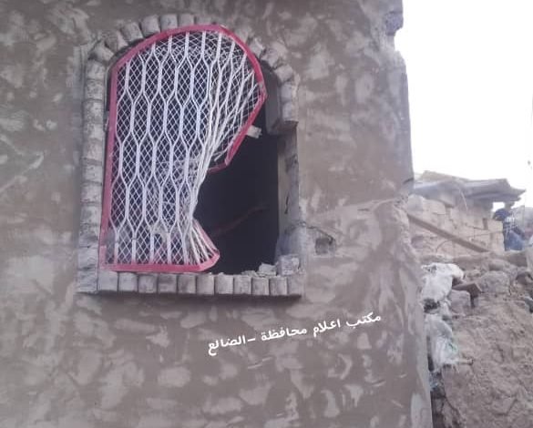 إصابة طفلين وتضرر منزلين وسط مدينة قعطبة في قصف صاروخي للمليشيات الحوثية على الضالع