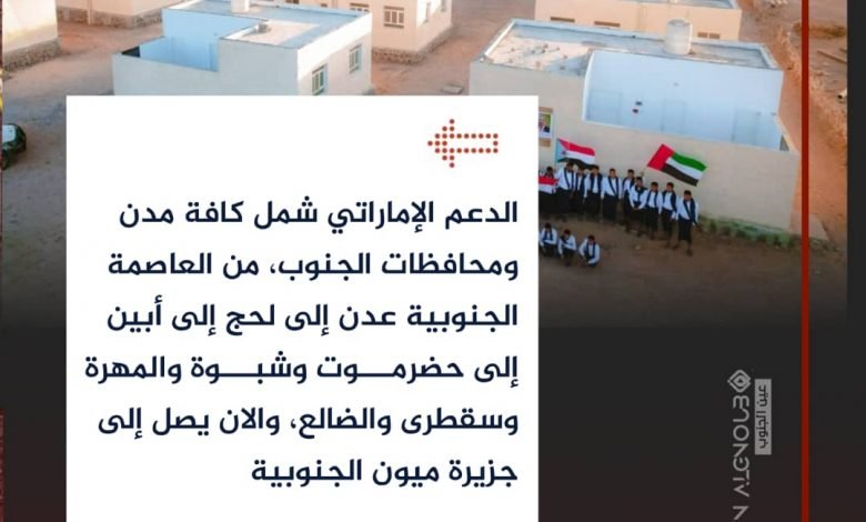 ونوهوا بأن الدعم الإماراتي شمل كافة مدن ومحافظات الجنوب، من العاصمة الجنوبية عدن إلى لحج إلى أبين إلى حضرموت وشبوة والمهرة وسقطرى والضالع، والان يصل إلى جزيرة ميون الجنوبية.