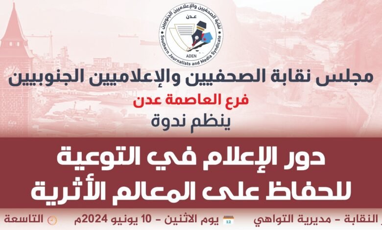 ينظم مجلس نقابة الصحفيين والإعلاميين الجنوبيين فرع العاصمة عدن، بعد غدا الأثنين، ندوة عن دور الإعلام في التوعية للحفاظ على المعالم الأثرية وذلك في مقر النقابة بمديرية التواهي.