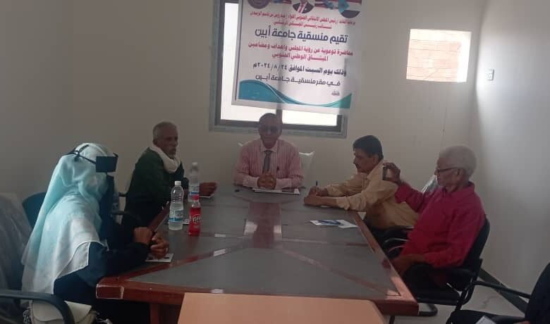 منسقية جامعة أبين تنظم محاضرة توعوية عن رؤية المجلس وأهداف ومضامين الميثاق الوطني الجنوبي.