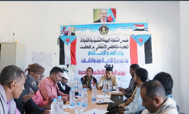 انتقالي المحفد بأبين ينظم لقاءً تشاورياً للإعلاميين والناشطين حول توحيد السياسة الإعلامية بالمديرية