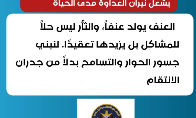 أطلقت الهيئة المجتمعية المساعدة لهيئة رئاسة المجلس الانتقالي الجنوبي، عبر منصاتها الرسمية على وسائل التواصل الاجتماعي، حملة توعوية لمكافحة ظاهرة الثأر والنزاعات القبلية