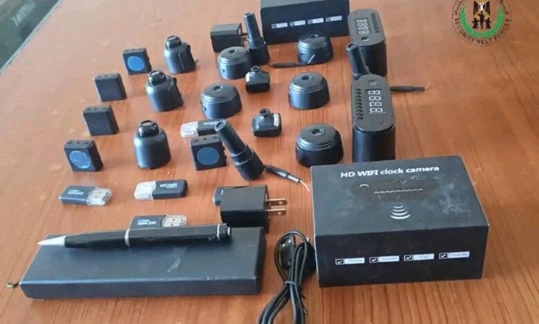 وفي التفاصيل، أوضح مصدر في عمليات حزام الطوق أن أفراد نقطة مصنع الحديد الواقعة شمال غرب العاصمة عدن، تمكنوا من ضبط 11 كاميرا تجسسية صغيرة الحجم، بالإضافة إلى كاميرات واي فاي على شكل ساعة سيارة، وقلم مزود بكاميرا، وخمسة لواقط كاميرا مع محتوياتها.