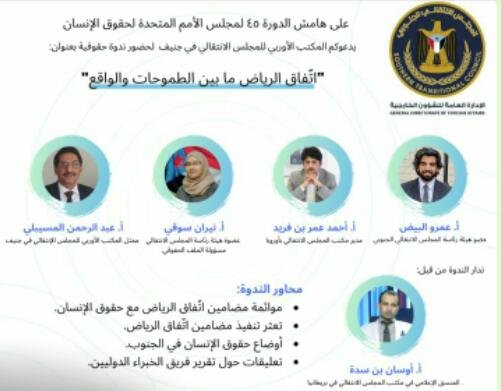 المكتب الأوربي للمجلس الانتقالي الجنوبي في جنيف يدعو إلى حضور ندوة حقوقية بعنوان ” اتفاق الرياض بين الطموح والواقع “