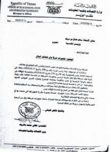 وتظهر الوثيقة طلب وزير الاتصالات بناءا على توجيها من الرئيس هادي ورئيس مجلس الوزراء من وزارة المالية الموافقة على تلبية مطالب شركة واي إنشاء سنترالات مركزية ومحطات لاسلكية وأنظمة فوترة جديدة.