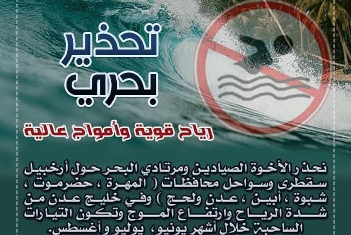 أصدرت خفر السواحل تحذيرًا هامًا للمواطنين، داعية إلى تجنب السباحة والاقتراب من السواحل، وكذلك السفر عبر البحر، خلال أشهر يونيو ويوليو وأغسطس من كل عام، في قطاع خليج عدن وقطاع البحر العربي والبحر الأحمر، ويعود السبب إلى ارتفاع منسوب الأمواج وتزايد قوة المد البحري، مما يشكل خطرًا كبيرًا على سلامة المواطنين، خاصة مع ارتفاع درجات الحرارة.