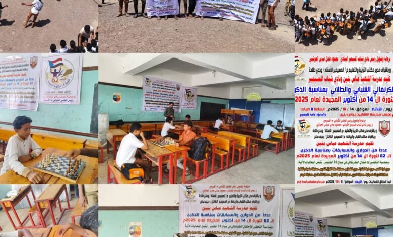 بمناسبة الذكرى 62 لعيد 14 أكتوبر، انطلقت صباح اليوم الفعاليات الرياضية والفكرية والثقافية في مدرسة الشهيد عباس رضوان بالمسيمير، محافظة لحج. تأتي هذه الفعاليات برعاية رئيس المجلس الشبابي – رئيس نادي شباب المسيمير الرياضي الثقافي الاجتماعي، القيادي محمود عادل الحوشبي.